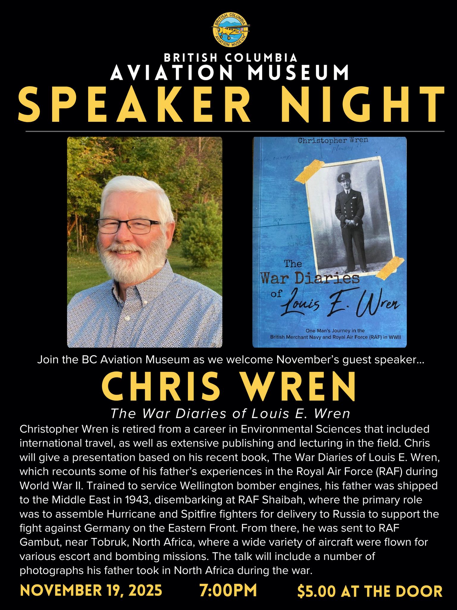 Join the BC Aviation Museum as we welcome November's Guest Speaker, Chris Wren. Chris will be speaking at the museum Wednesday, November 19th at 7pm, tickets can be purchased at the door for $5 a head.