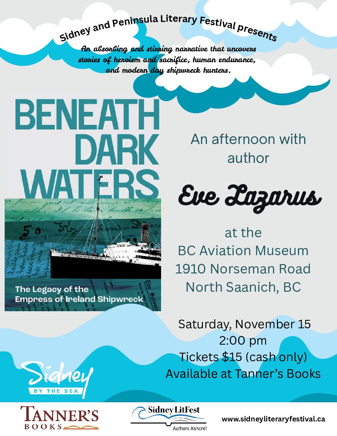 Delve into History November 15, 2025, 2:00pm Please join us at The BC Aviation Museum (1910 Norseman Road, North Saanich) for an afternoon with Eve Lazarus on Saturday, November 15 at 2:00 p.m. Eve will read from and talk about her latest book, Beneath Dark Waters: The Legacy of The Empress of Ireland Shipwreck. Tickets […]