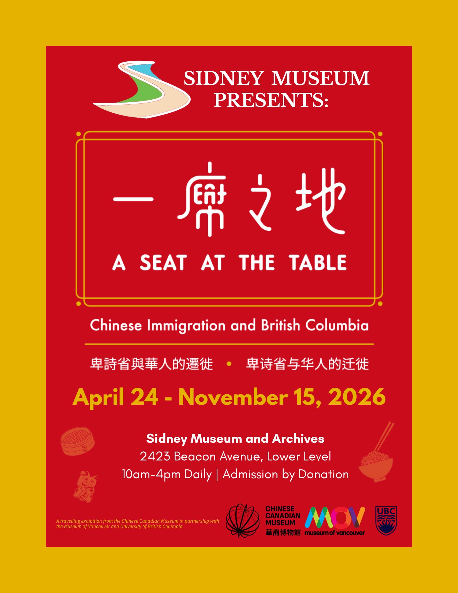 Sidney Museum and Archives 2423 Beacon Ave, SIDNEY, BC, CanadaThe Sidney Museum and Archives is excited to announce the opening of its 2026 featured exhibit, A Seat at the Table: Chinese Immigration and British Columbia. Developed by the Chinese […]